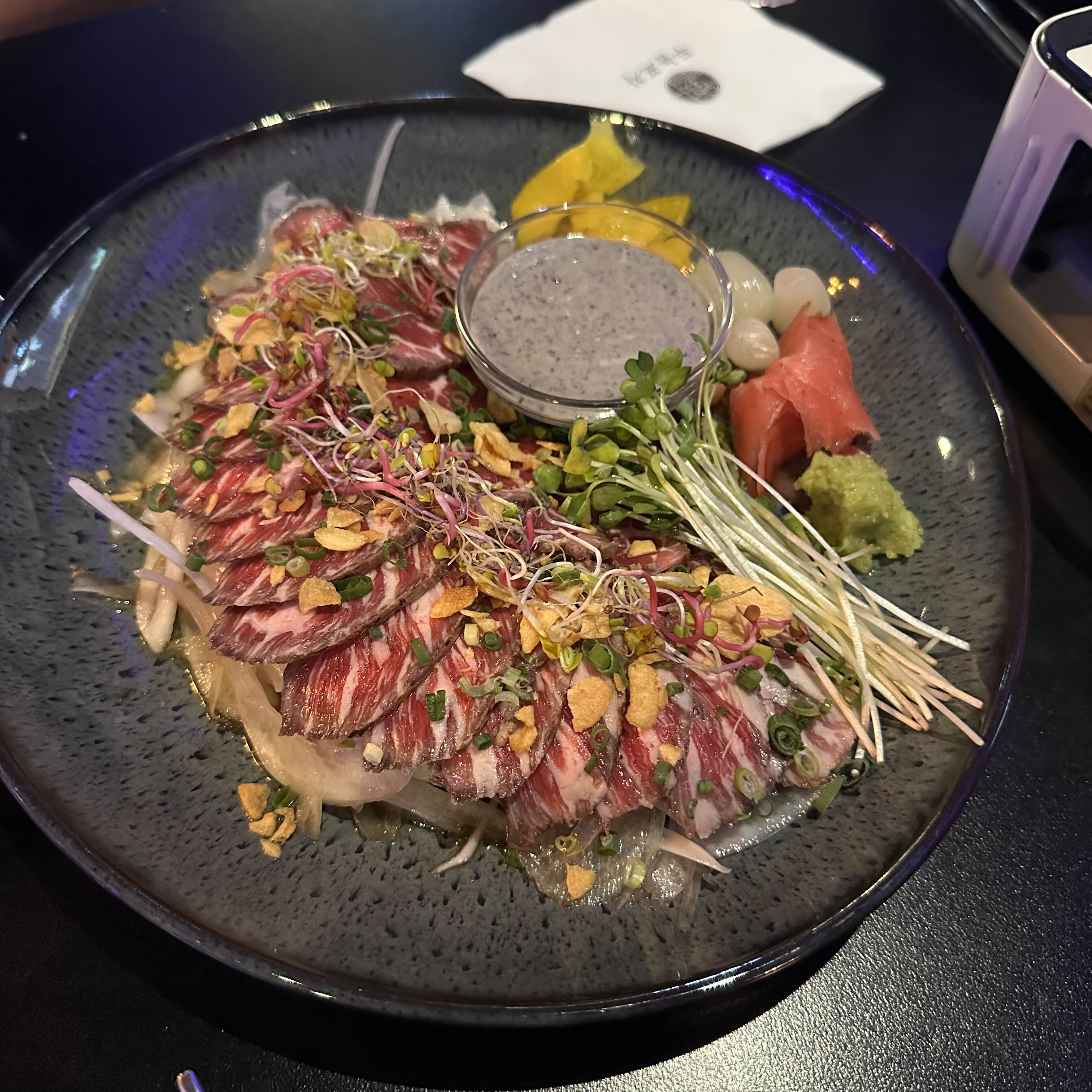 얇게썬 소고기 위에 마늘칩, 무순, 새싹, 소스까지 완벽하니 너무 맛있어 보이더라고요